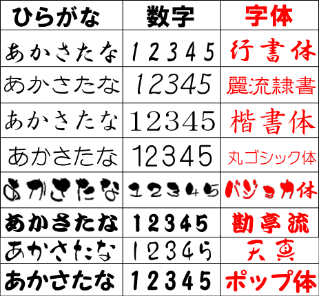 字体(フォント)の指定を希望される場合は、具体的な文字の字体(フォント名)を連絡事項記入欄にご記入ください。指定が無い場合は当店で指定いたします。