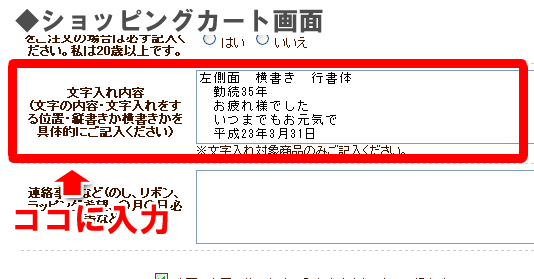 注文画面にある文字入れ内容記入欄に例のように文字内容を入力してください。
