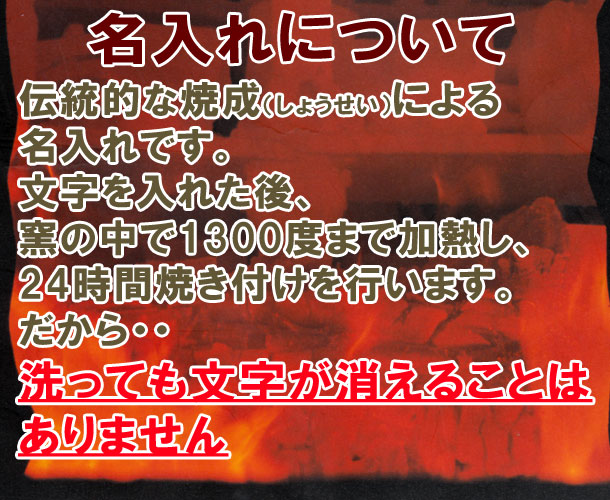 父の名前を焼酎サーバーに文字入れしてもらったんですが、出来上がりがとっても素敵で受け取った父もたいへん満足してくれました☆★☆自分の名前が入った器で飲むお酒は格別だと晩酌には欠かせないものになったみたいです。このお店にお任せしてよかったです。