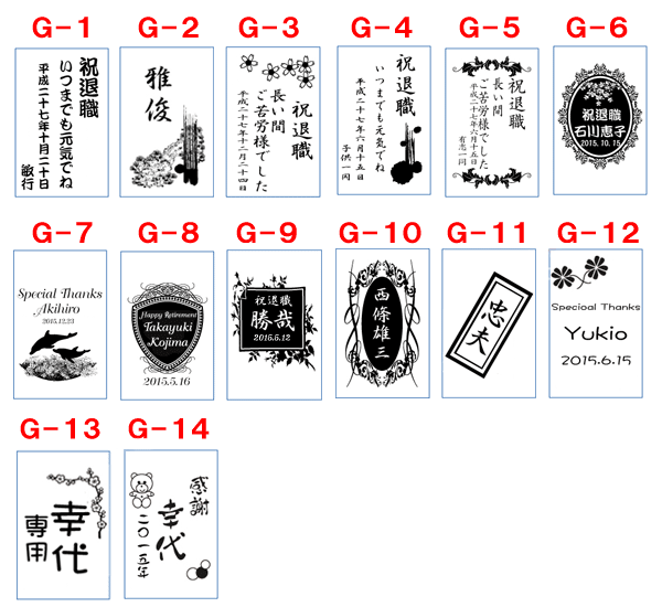14種類のデザインの見本からお好きな文字入れパターンが選べます。 |