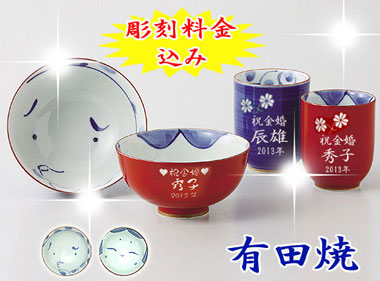 | 有田焼 彫刻 夫婦茶碗+夫婦湯呑み おかめひょっとこ |