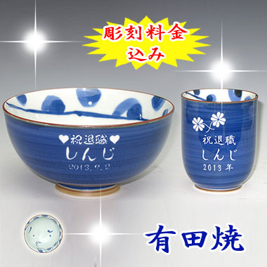 | 有田焼 彫刻 茶碗+湯呑み ひょっとこ(青) |