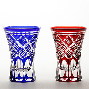 伝統的な江戸切子。キレイな青と赤のぐい飲みです。専用の化粧箱に入れてお届けいたします☆