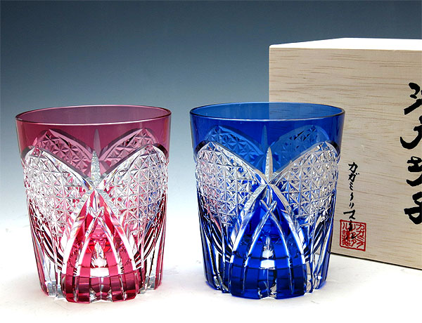 名入れ 江戸切子 ペアロックグラス 斜十文字に笹の葉 カガミクリスタル(tps493-2671-abori)