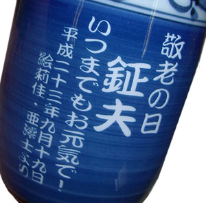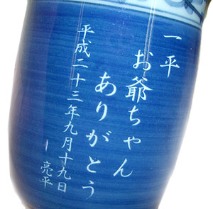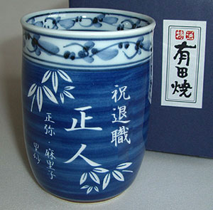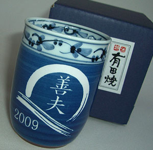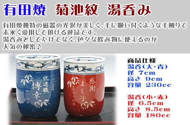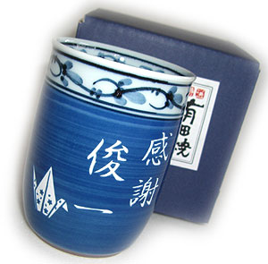 | 退職祝いにおススメ♪ 有田焼 湯呑(大・青) 菊池紋 (彫刻料金込) |