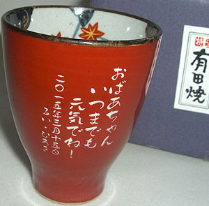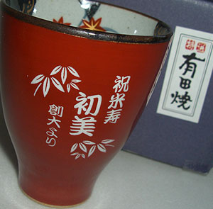 | 退職祝いにおススメ♪ 有田焼 湯呑(赤) 春秋 (彫刻料金込) |