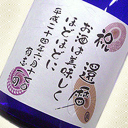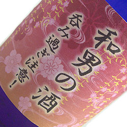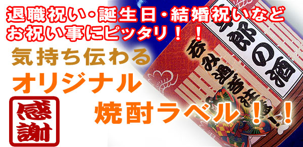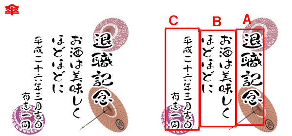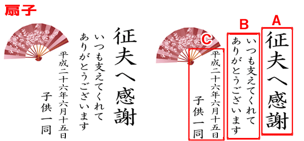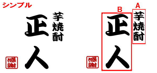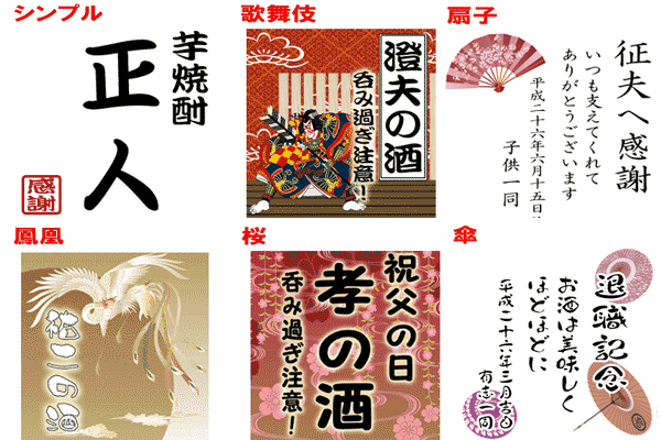 【パターン シンプル・歌舞伎・桜の例】 A:芋焼酎(10文字まで) B:誠司(10文字まで) 【パターン 扇子・傘の例】 A:義男の酒(10文字まで) B:いつも元気で(10文字まで) 楽しい酒を(10文字まで) C:平成二十六年六月十五日(日付以外でもOKです) 家族一同(10文字まで)