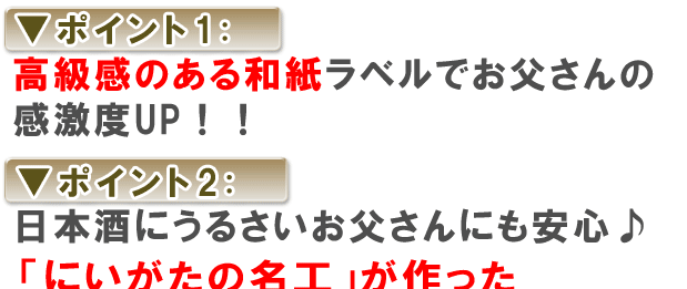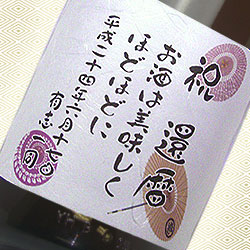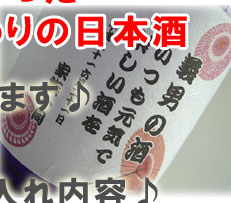 | 日本酒が大好きな父親に贈りました。日本酒に名入れしてくれるところはそんなに多くないので助かりました。父親からお礼の電話がありとても喜んでいました。ありがとうございました。 |